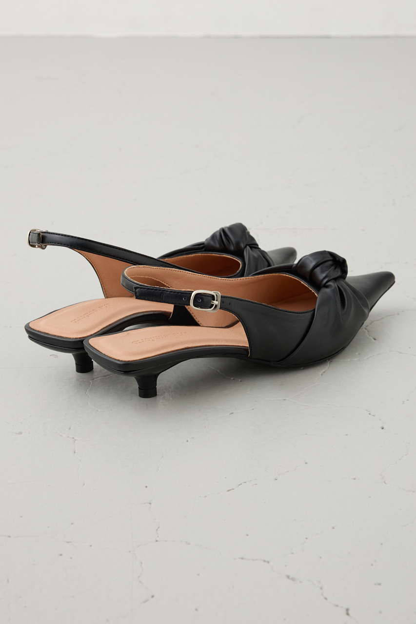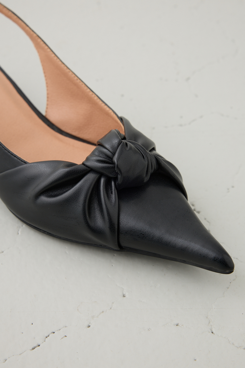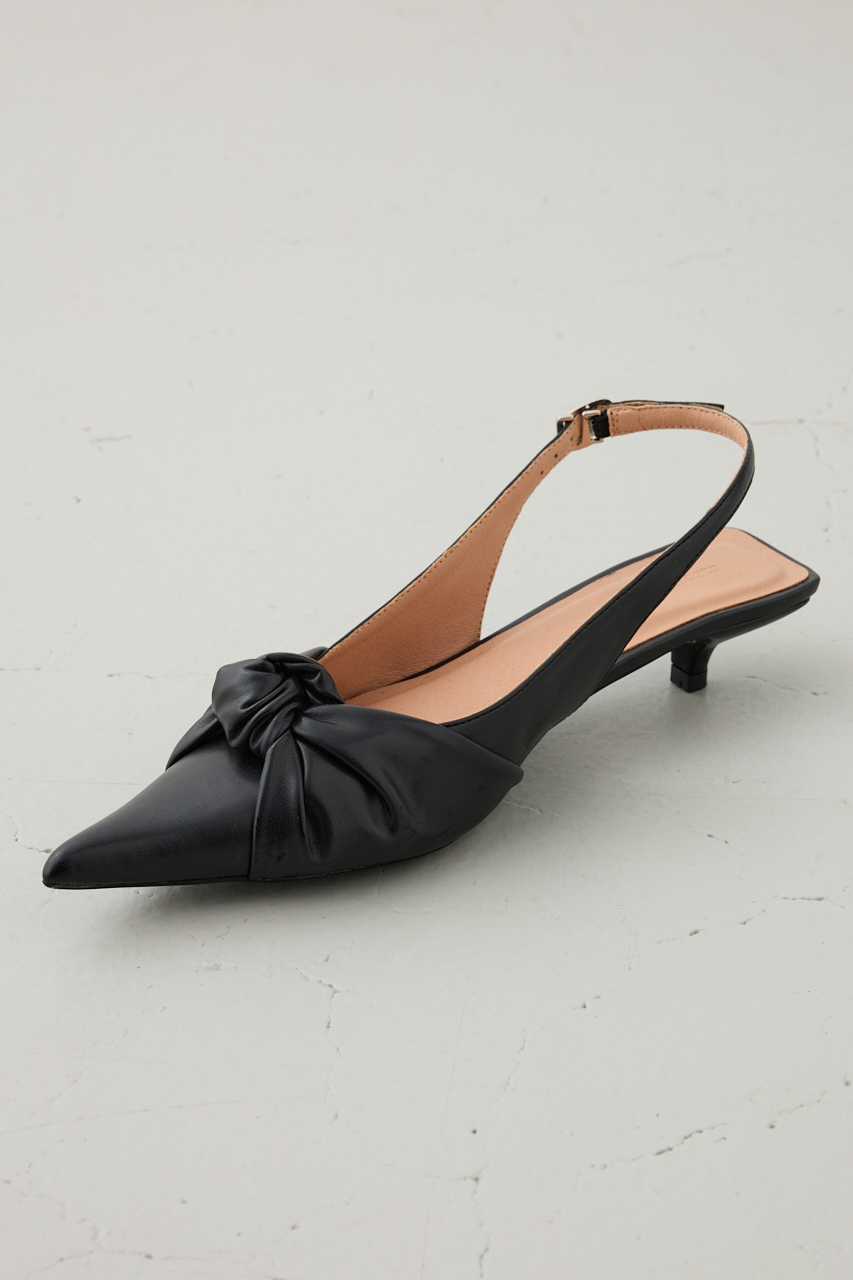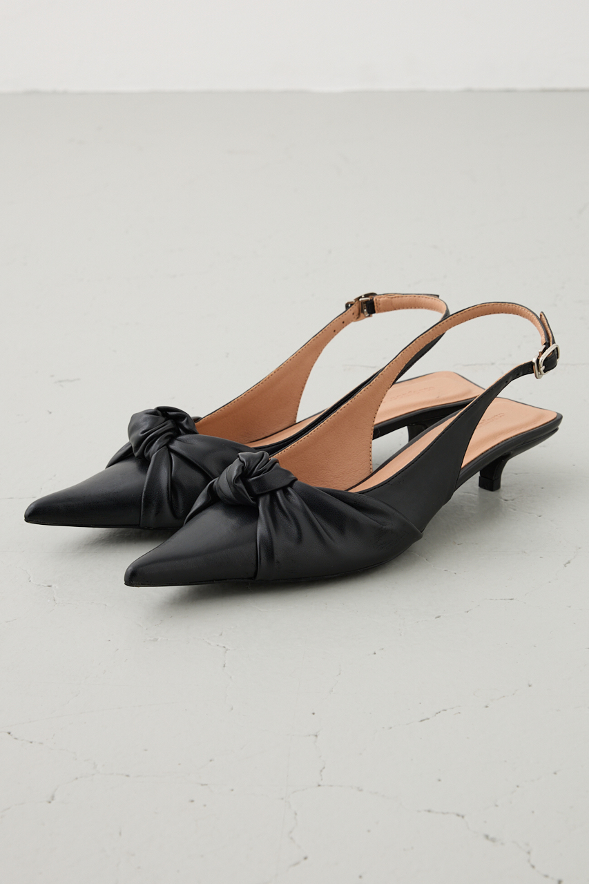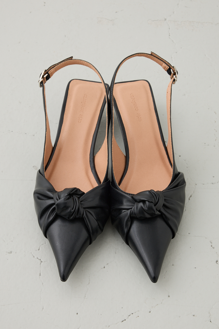甲のリボンのような結び目が印象的なポインテッドのバックストラップパンプス。
