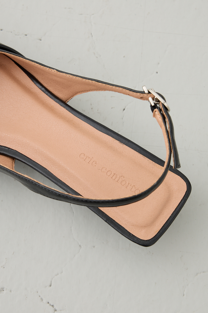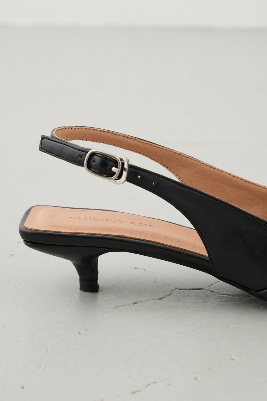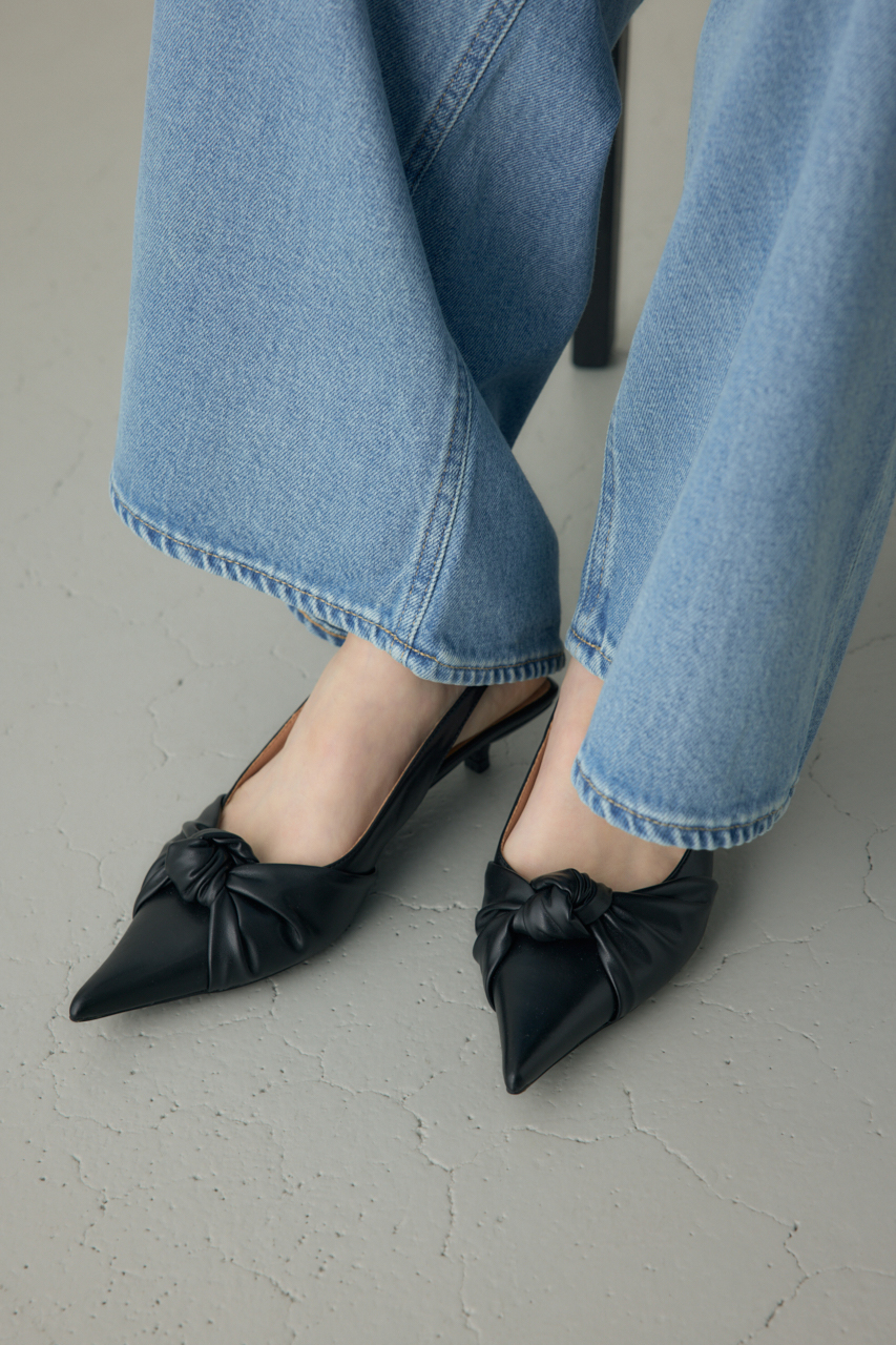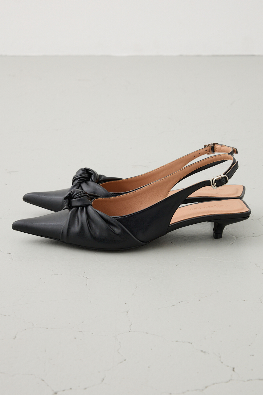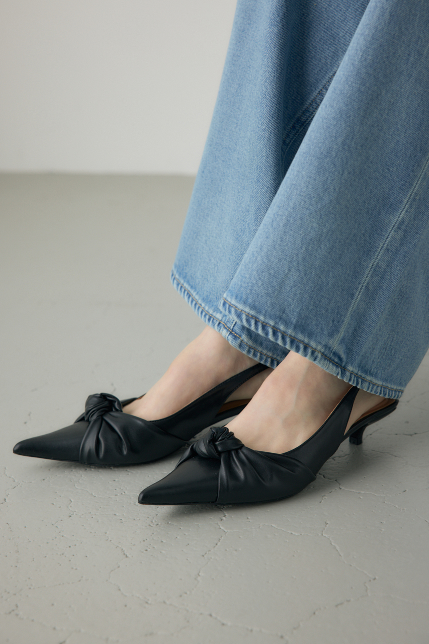 甲のリボンのような結び目が印象的なポインテッドのバックストラップパンプス。