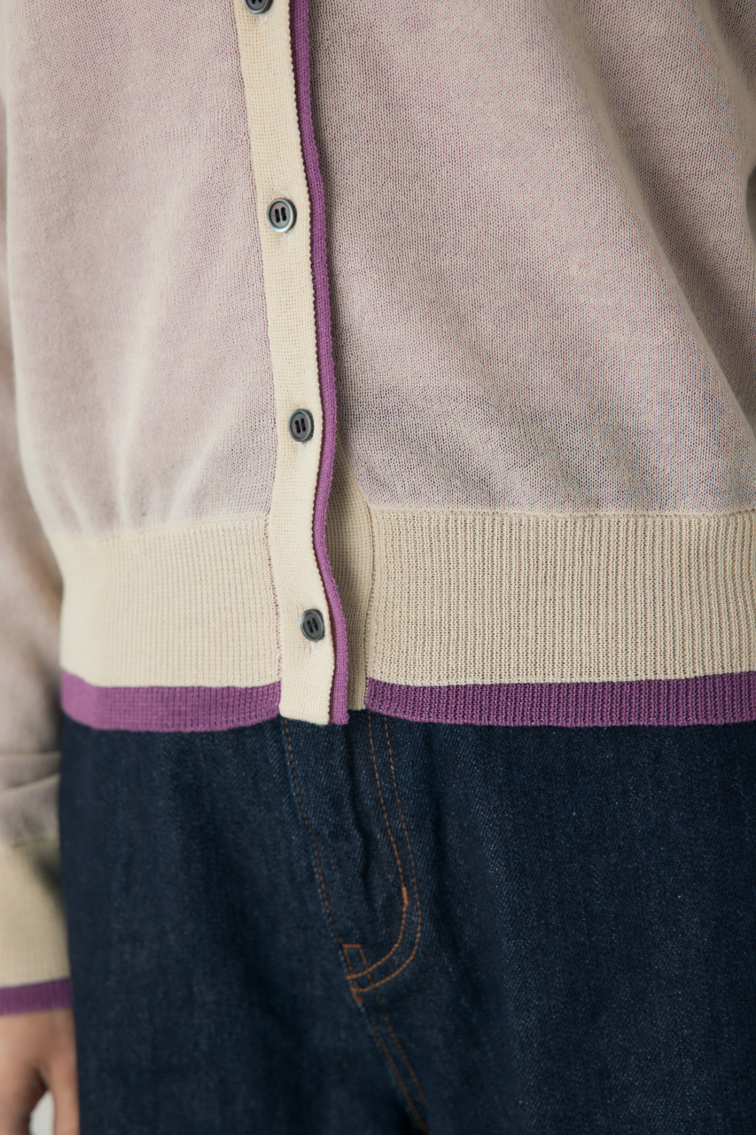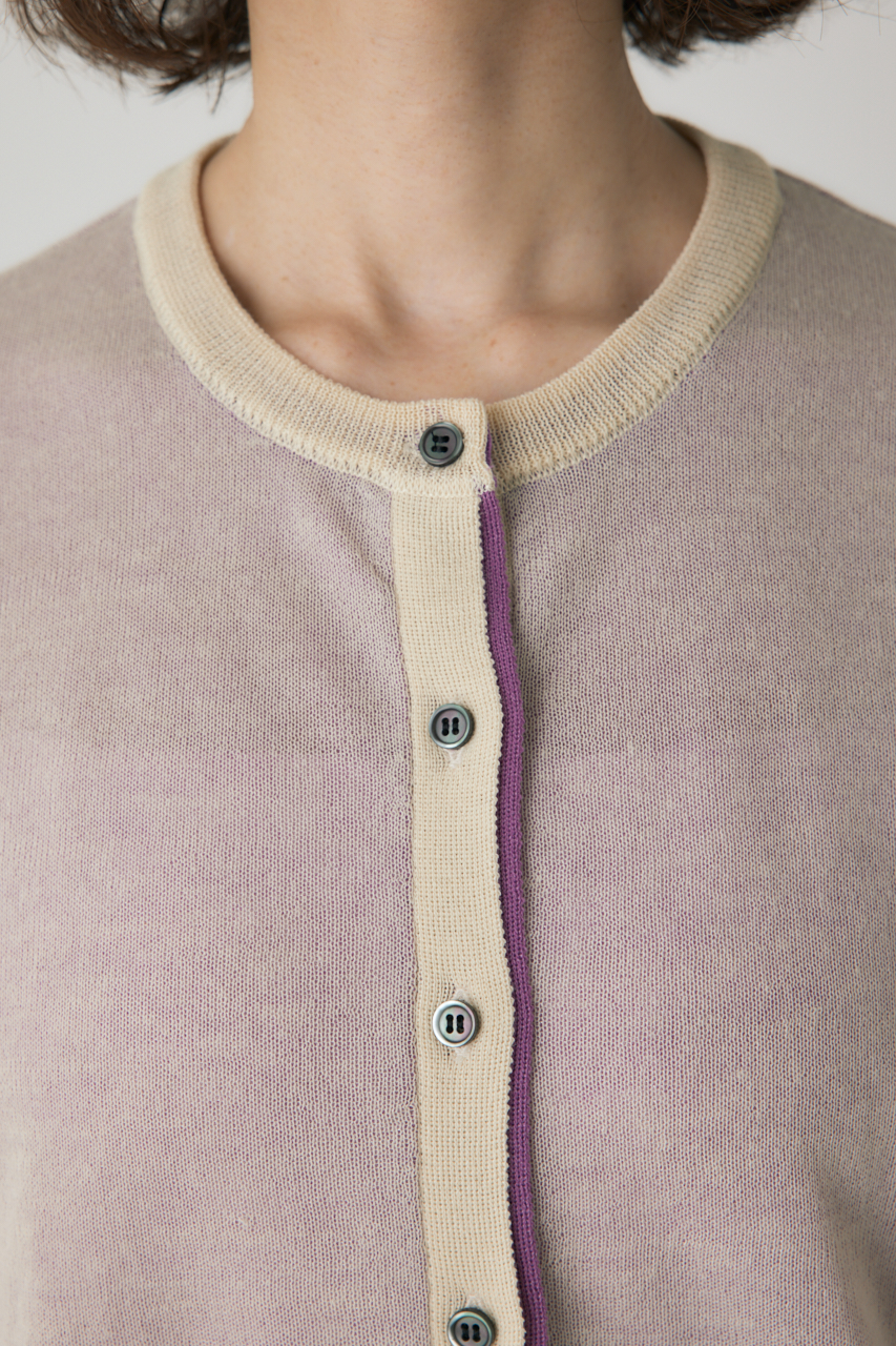 透ける糸を2枚重ねで編み上げた、色の重なりと透け感を楽しんで頂けるニットカーディガンです。