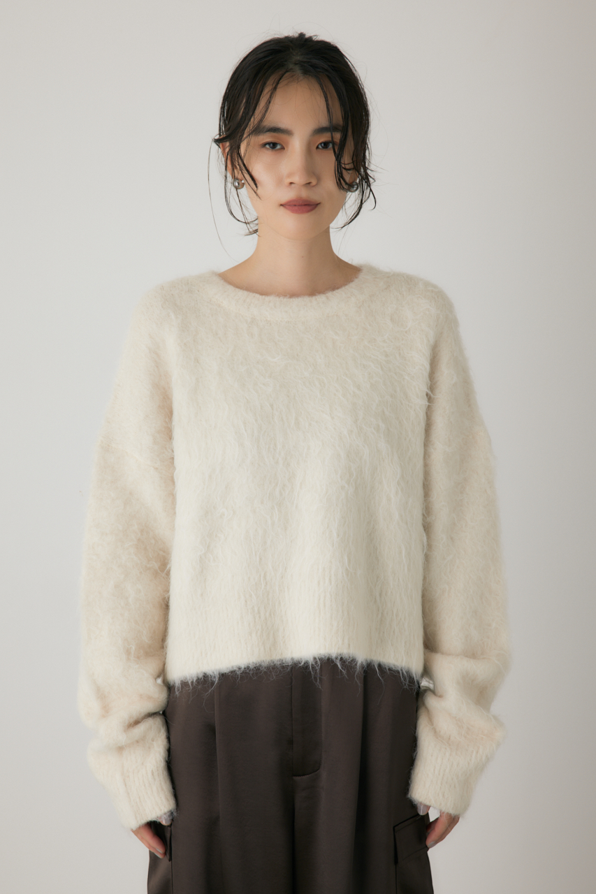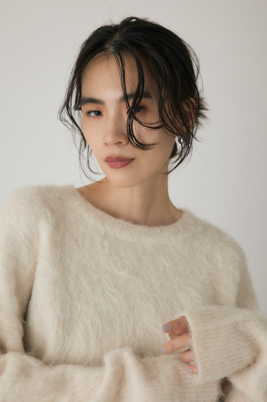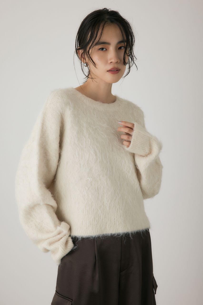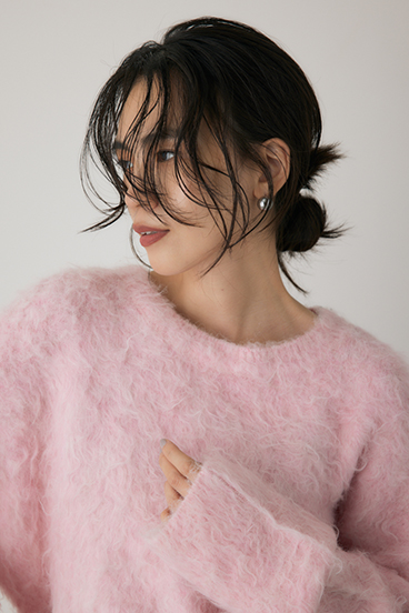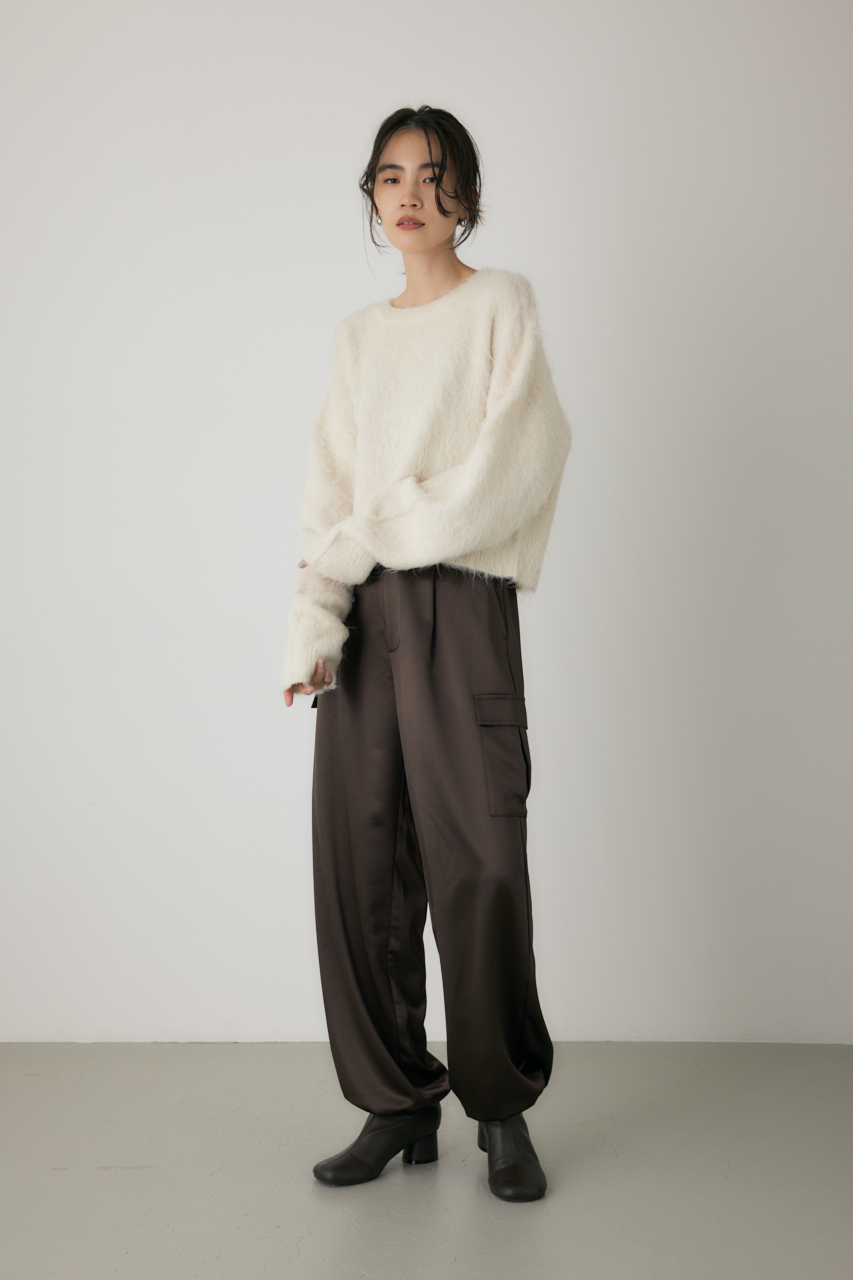 毛足の長いアイテムなので、サテンなどのツルッとしたアイテムとのコントラストのある合わせがおすすめです。