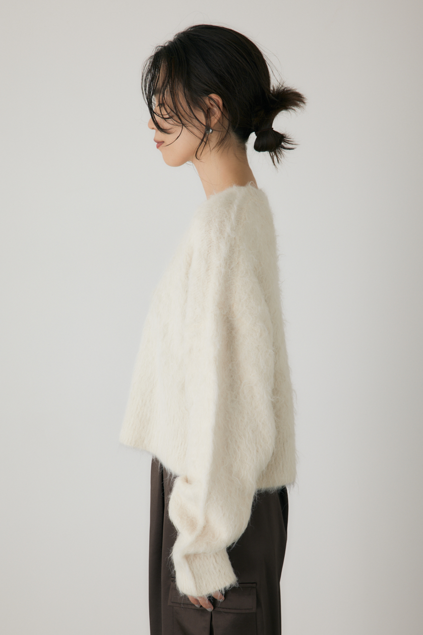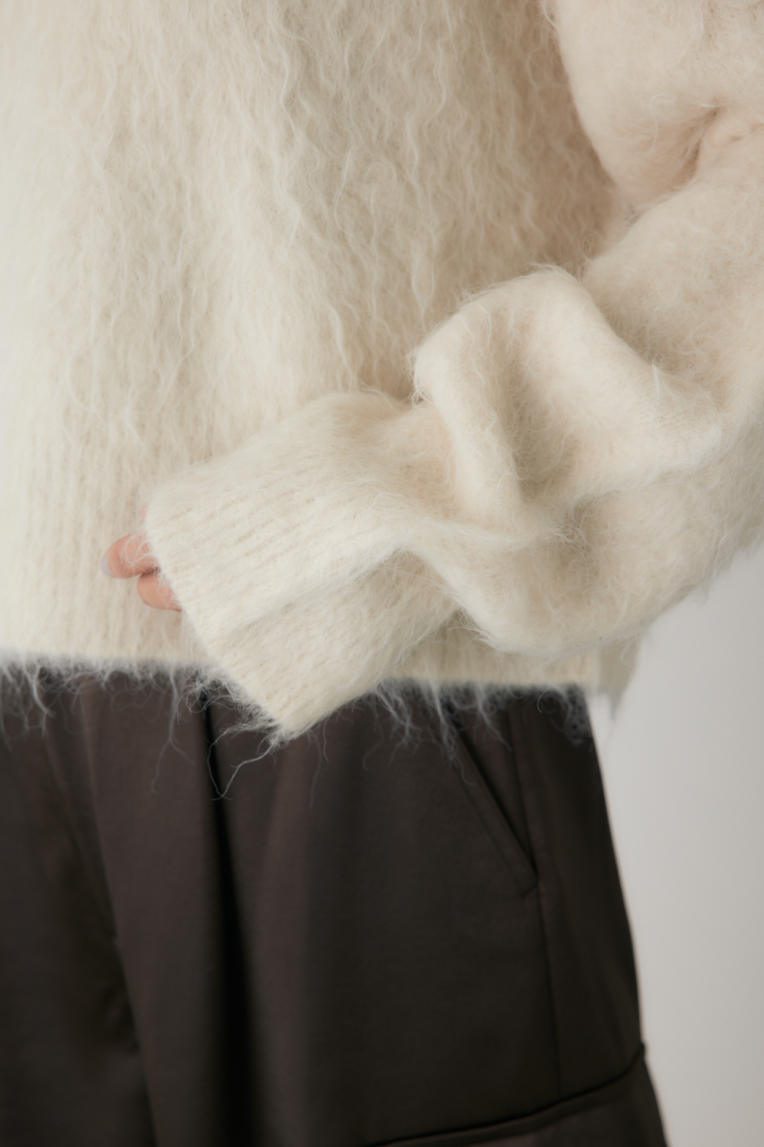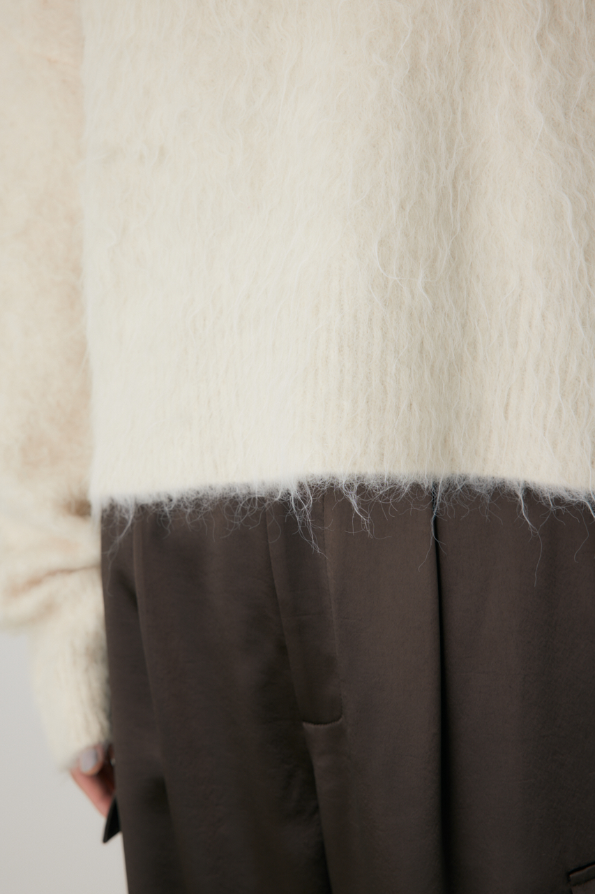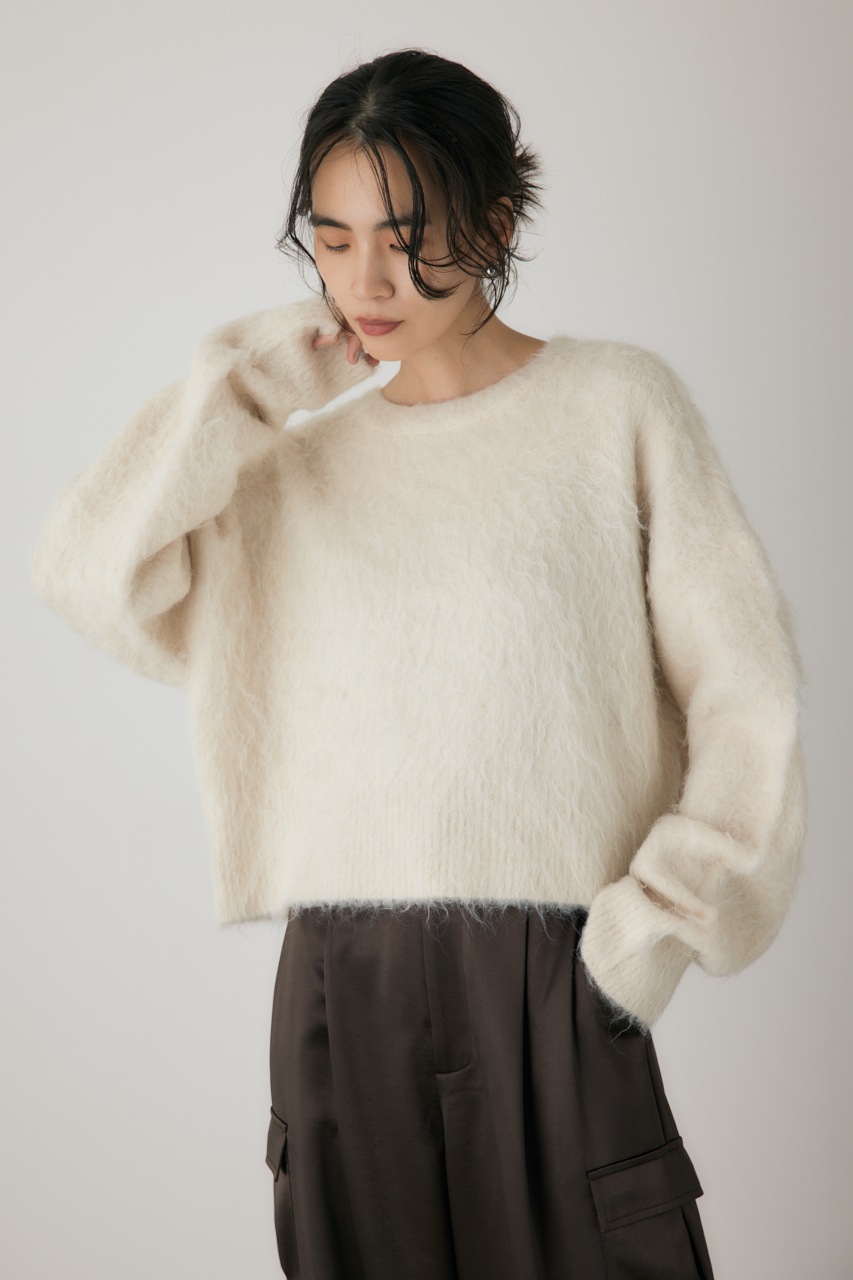 毛足の長いアイテムなので、サテンなどのツルッとしたアイテムとのコントラストのある合わせがおすすめです。