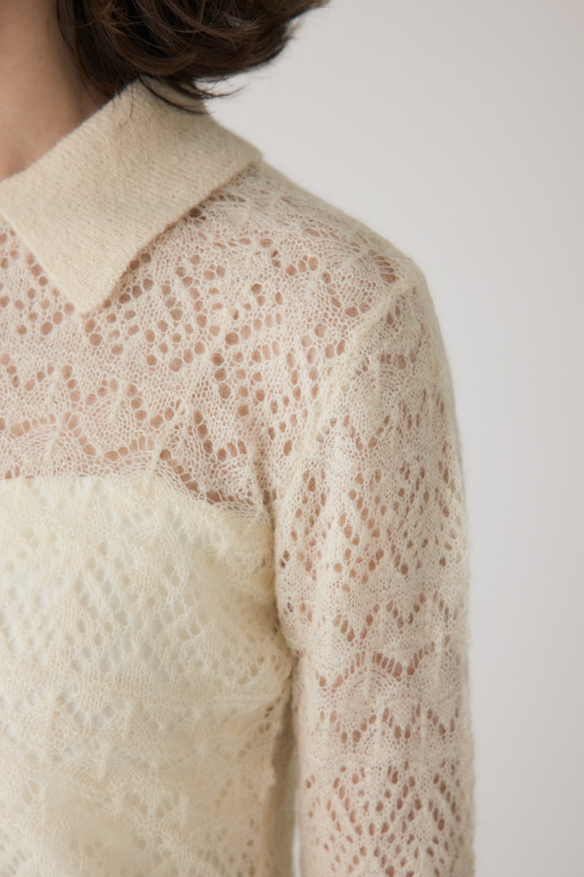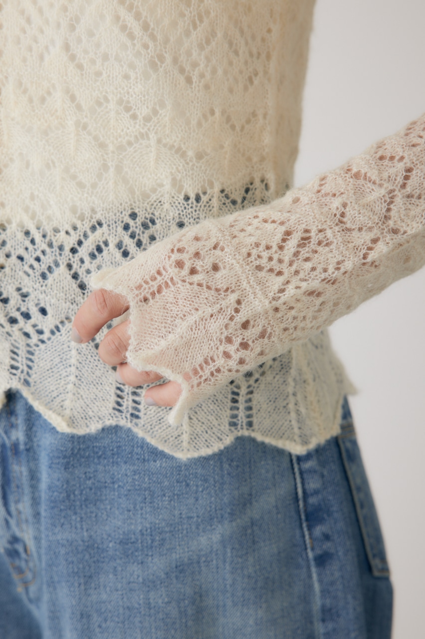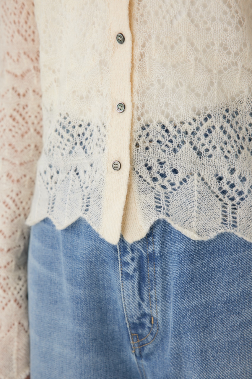 獣毛混の華奢な糸を使用して、繊細な透かし編みを作っています。