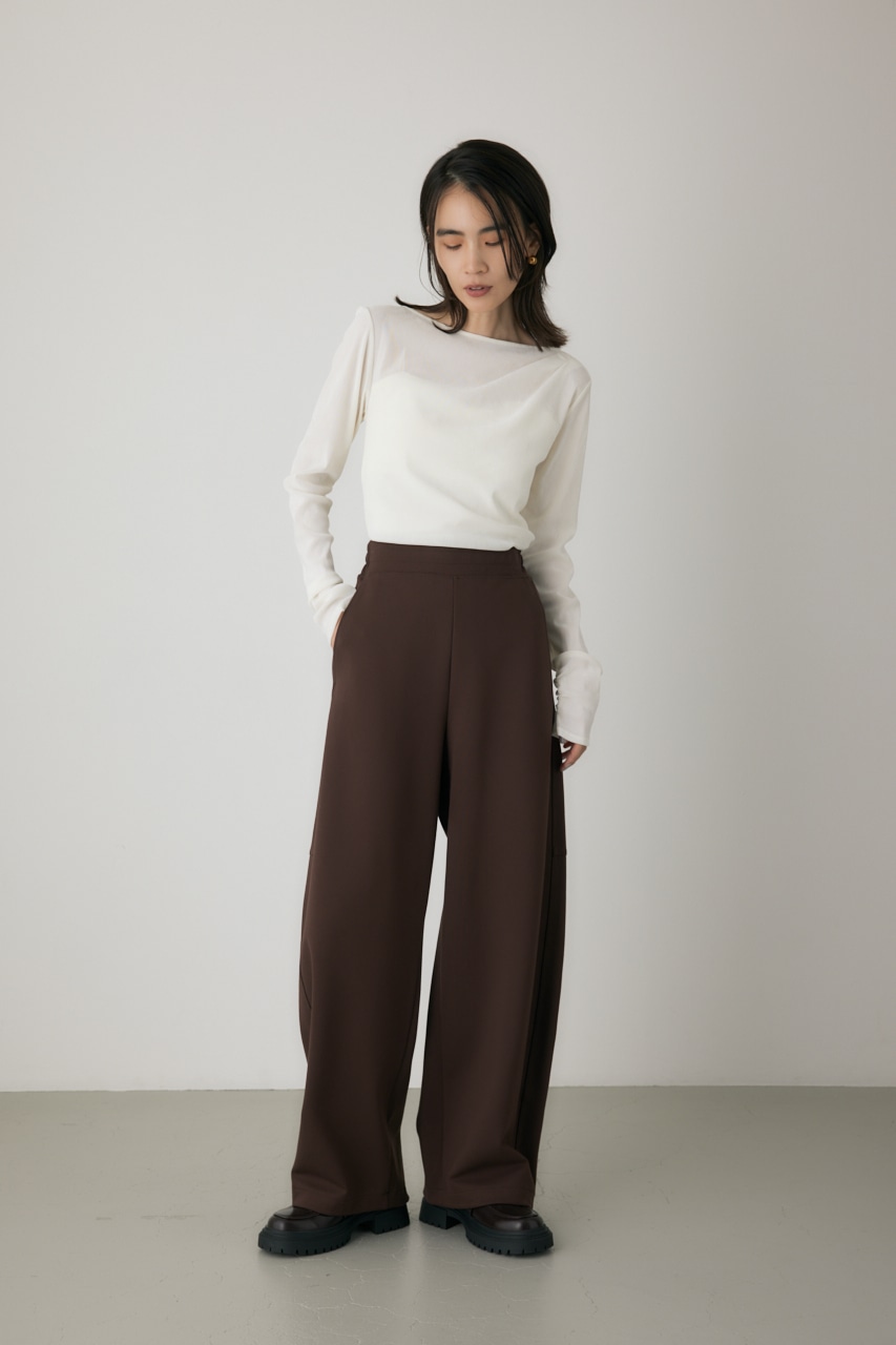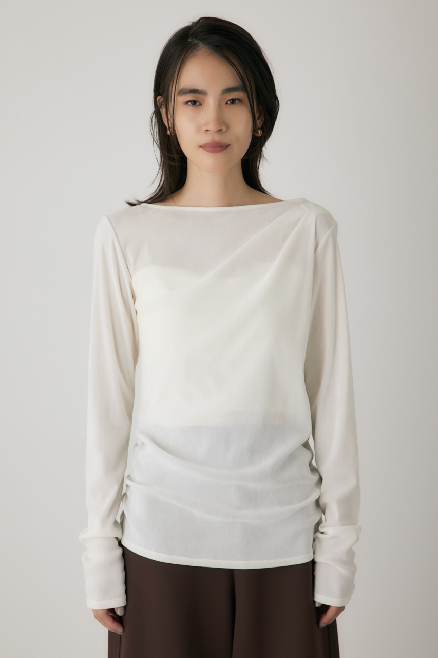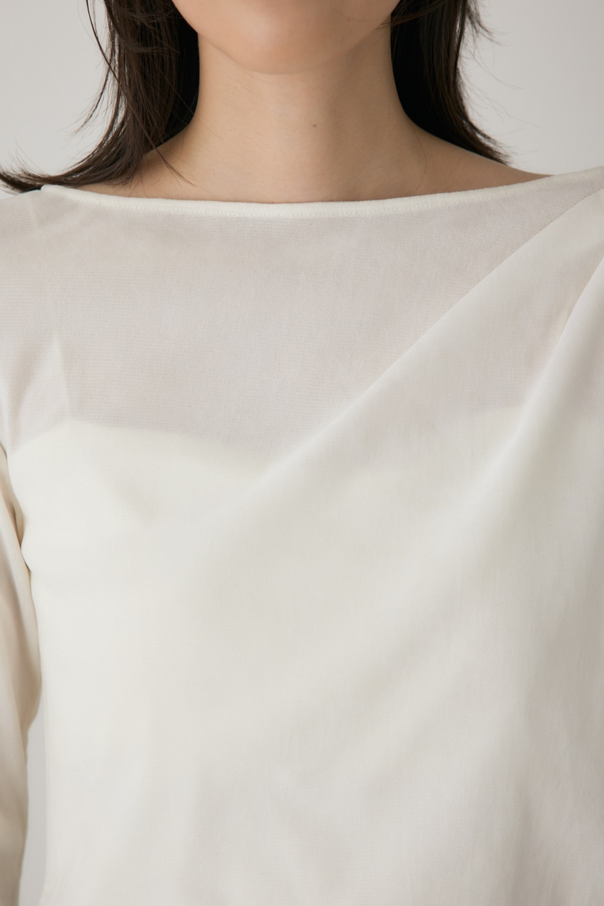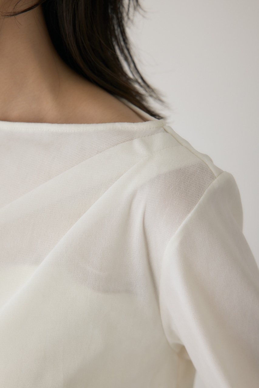 アシンメトリーに入った衿ぐりのタックが女性らしい