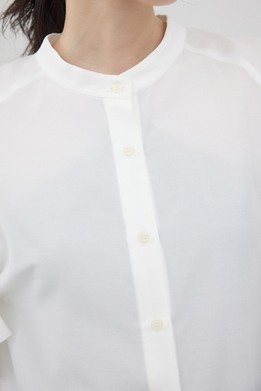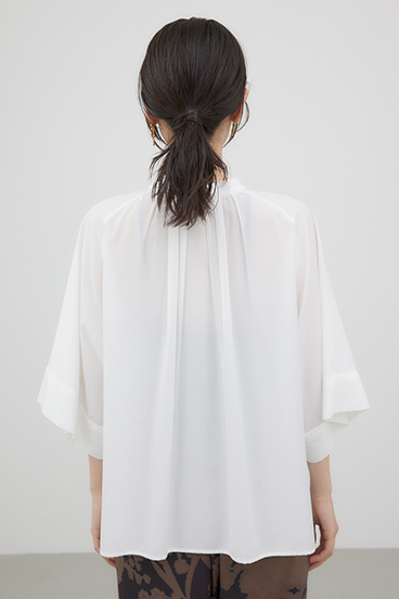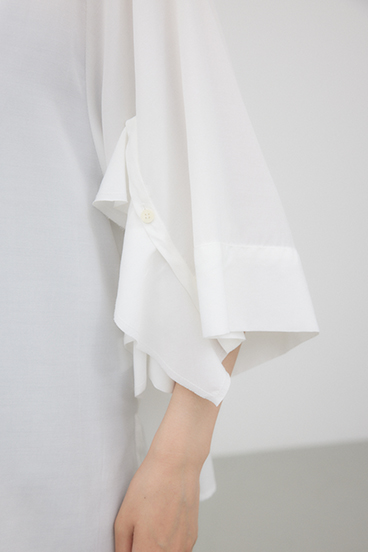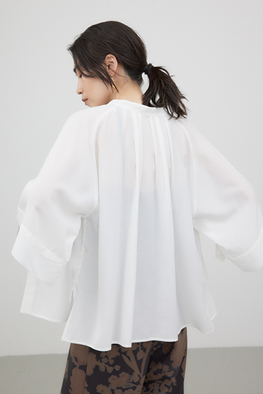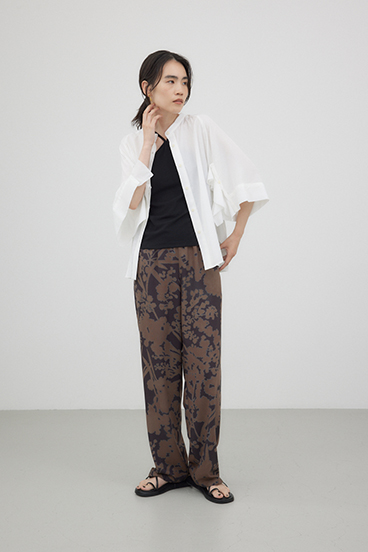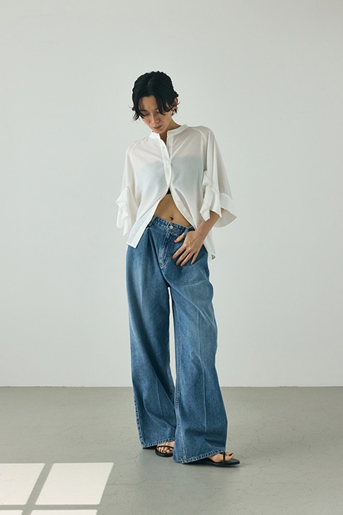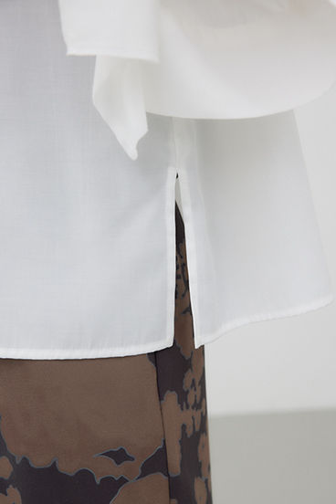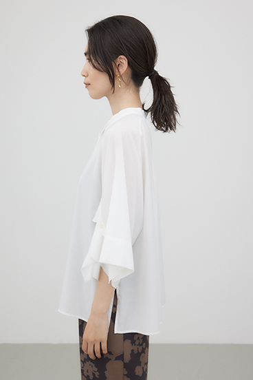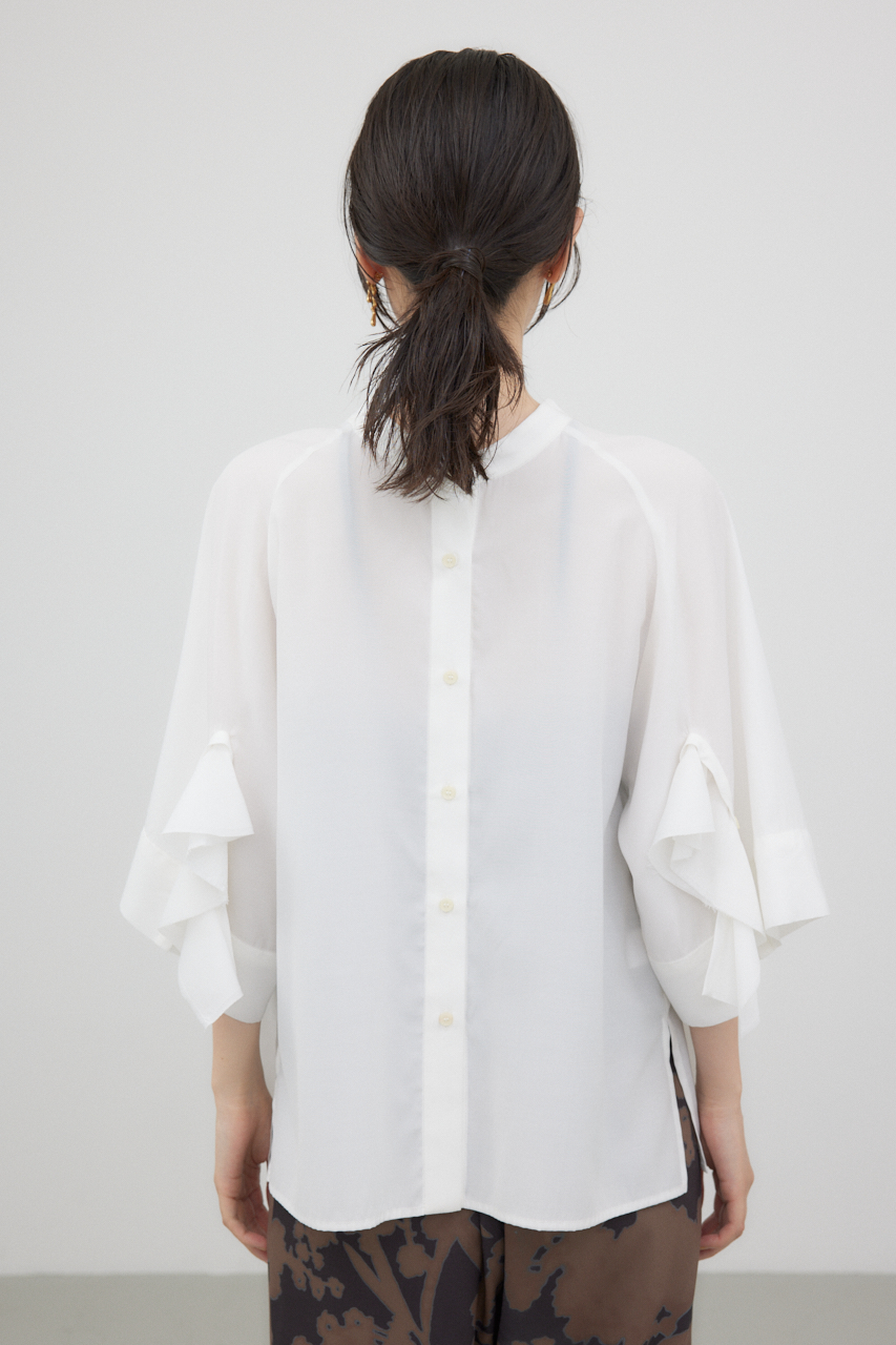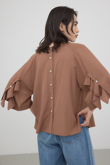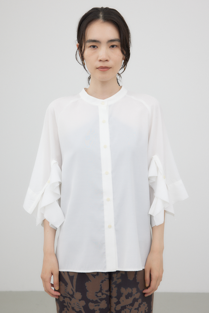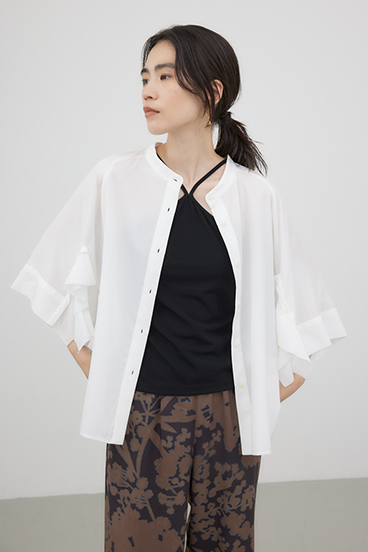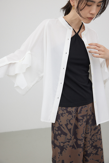 剣ボロに入ったラッフルフリルが印象的なデザインのシャツ。