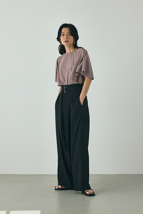ウエストのベルトがポイントになってくれる、フロントラップのワイドパンツ。