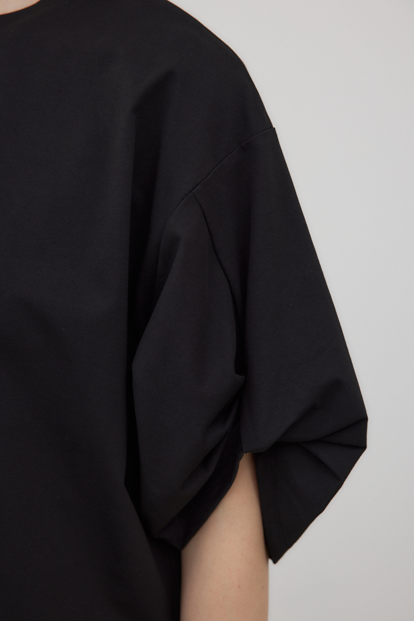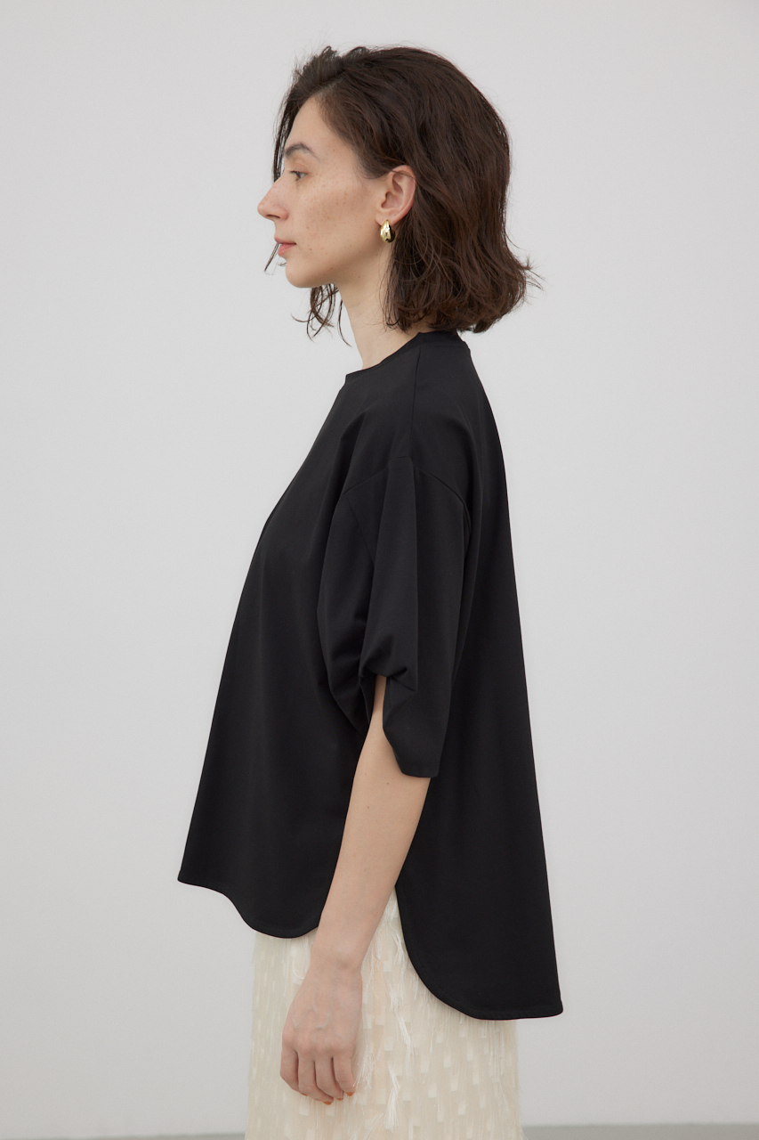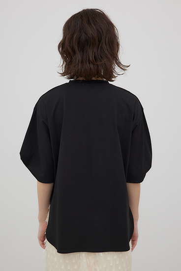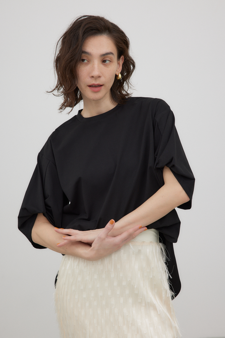 袖を捻ったようなデザインを加えた、シンプルなTシャツ。
