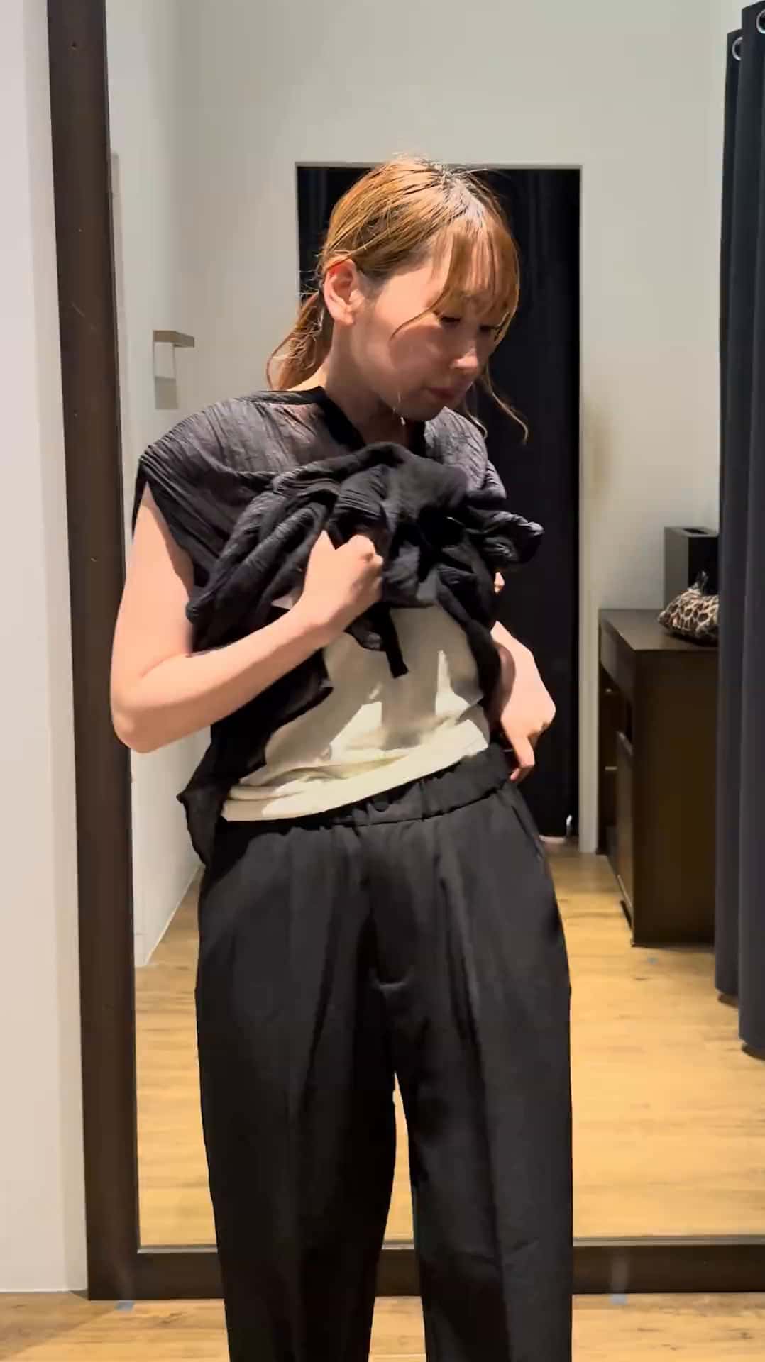 162cm/骨格ウェーブトップス→freeボトムス→M一着でコーデの決まるビスチェ!デニムやタイトスカートにも合う🤩ボトムスは、ウエストゴムですごく履きやすい!ウエストの部分しか伸びず、しっかりとした生地のタックの入ったワイドパンツ🎀