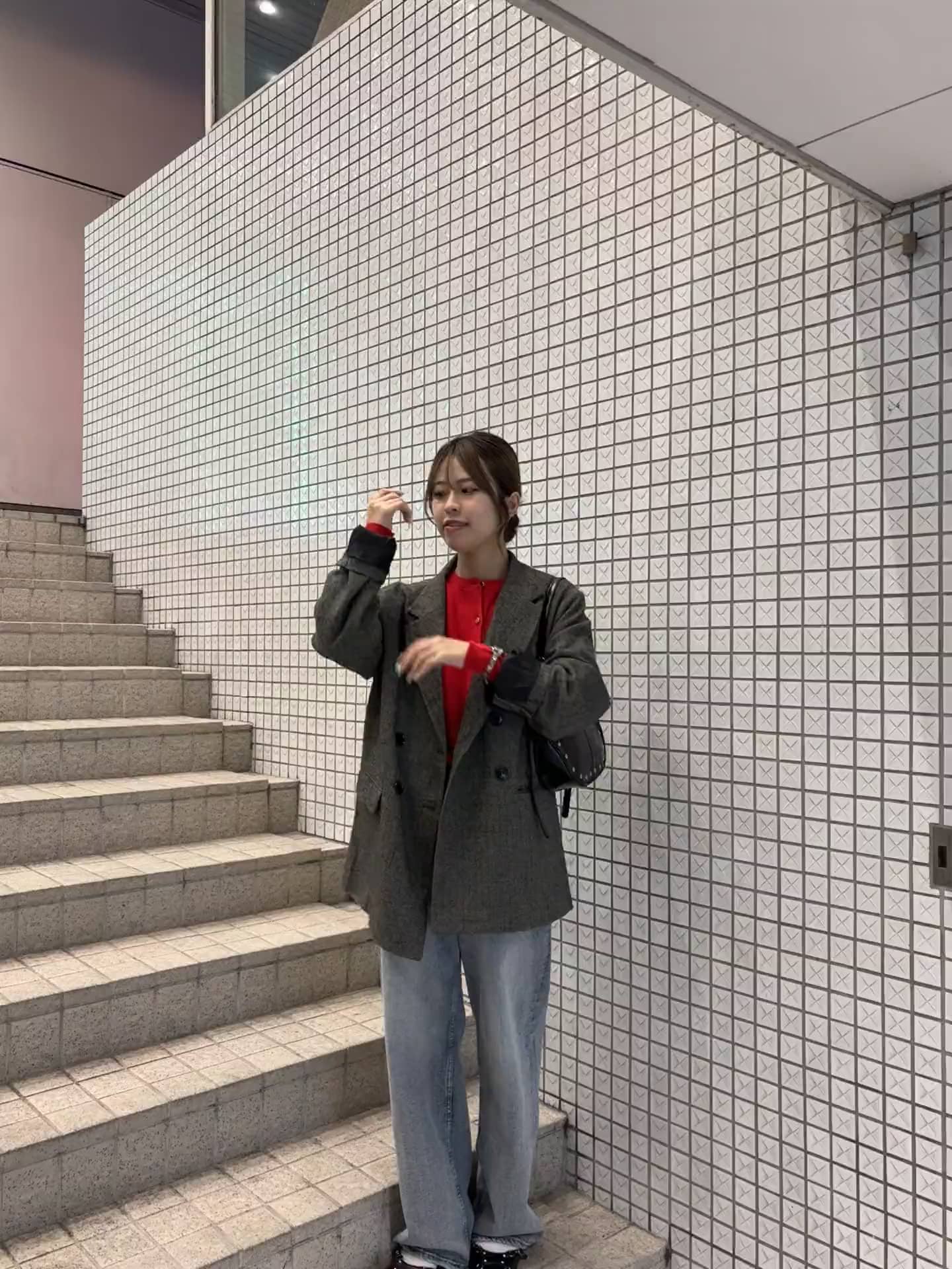 ジャケットの中に着ている赤の格上げニットは、形がとってもきれいで着心地も抜群の神アイテムです!❤️