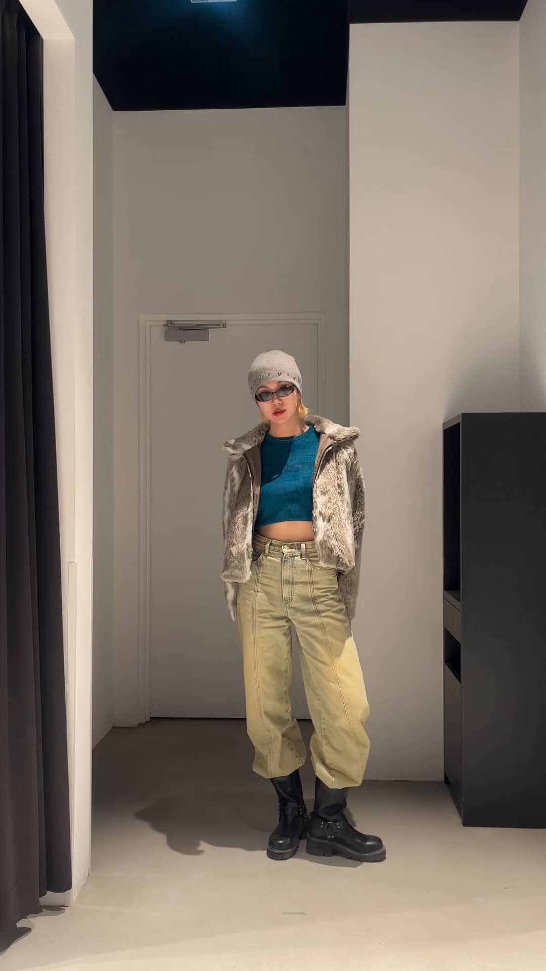 身長169cm。アウター、デニム→Mサイズ着用。フリーサイズのトップスは、インをせずに内側に折って丈感を調整しています。